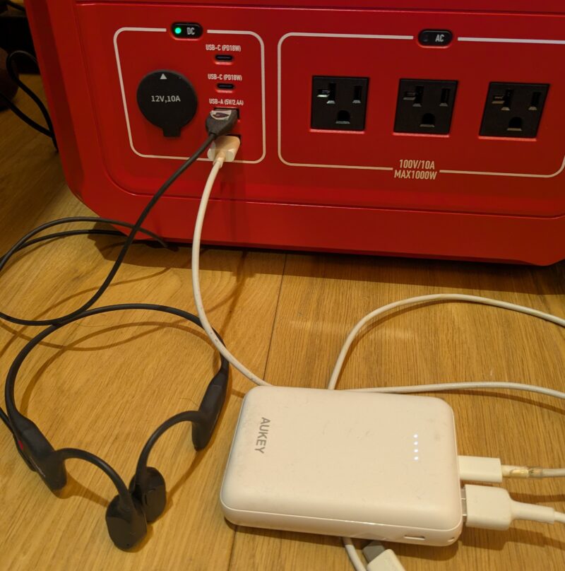 スマホ用モバイルバッテリーは週1回程度、骨伝導イヤホンはほぼ毎日、ポータブル電源から充電しています。
